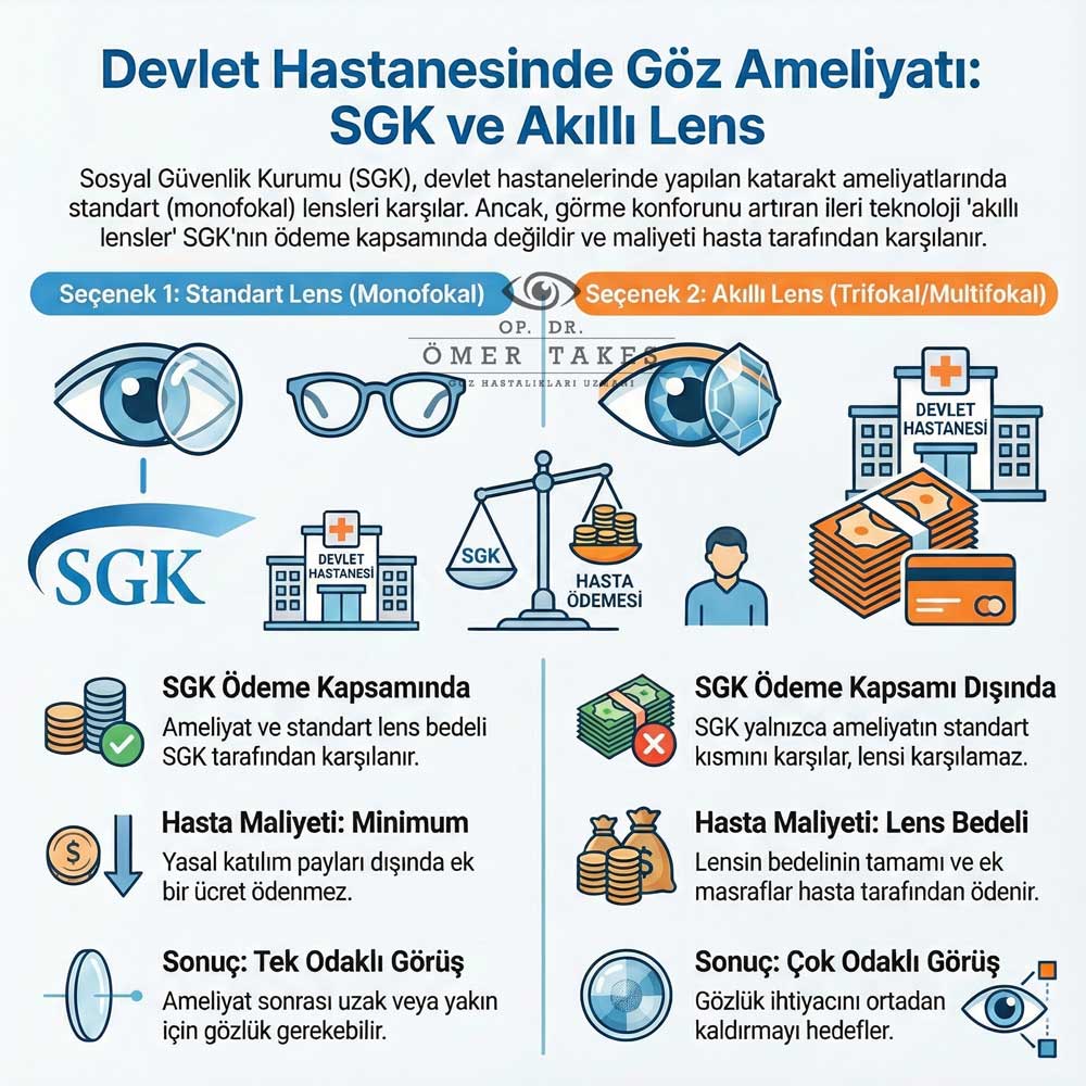 SGK, devlet hastanelerinde yapılan katarakt ameliyatlarında standart monofokal lensleri karşılamaktadır. Akıllı lensler bu kapsamda değildir.