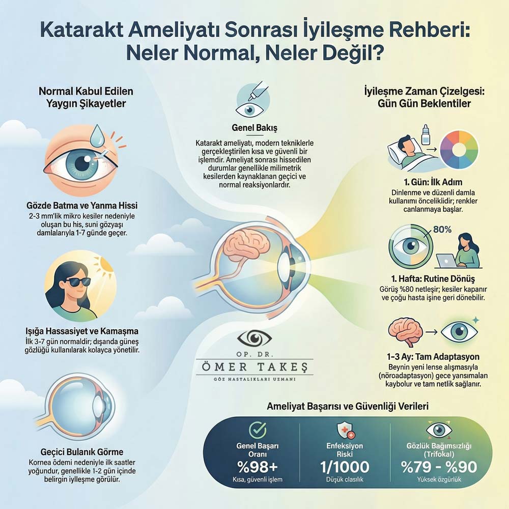 Şikayetler damlalarla yönetildikten sonra net görüşe geçiş başlar. Katarakt ameliyatı yorumları, iyileşmenin öngörülebilir ve hızlı olduğunu vurgular. Çoğu hasta ertesi gün günlük hayata döner, tam sonuçlar haftalar içinde belirir. Düzenli kontrollerle süreç sorunsuz ilerler, komplikasyonlar nadir görülür.