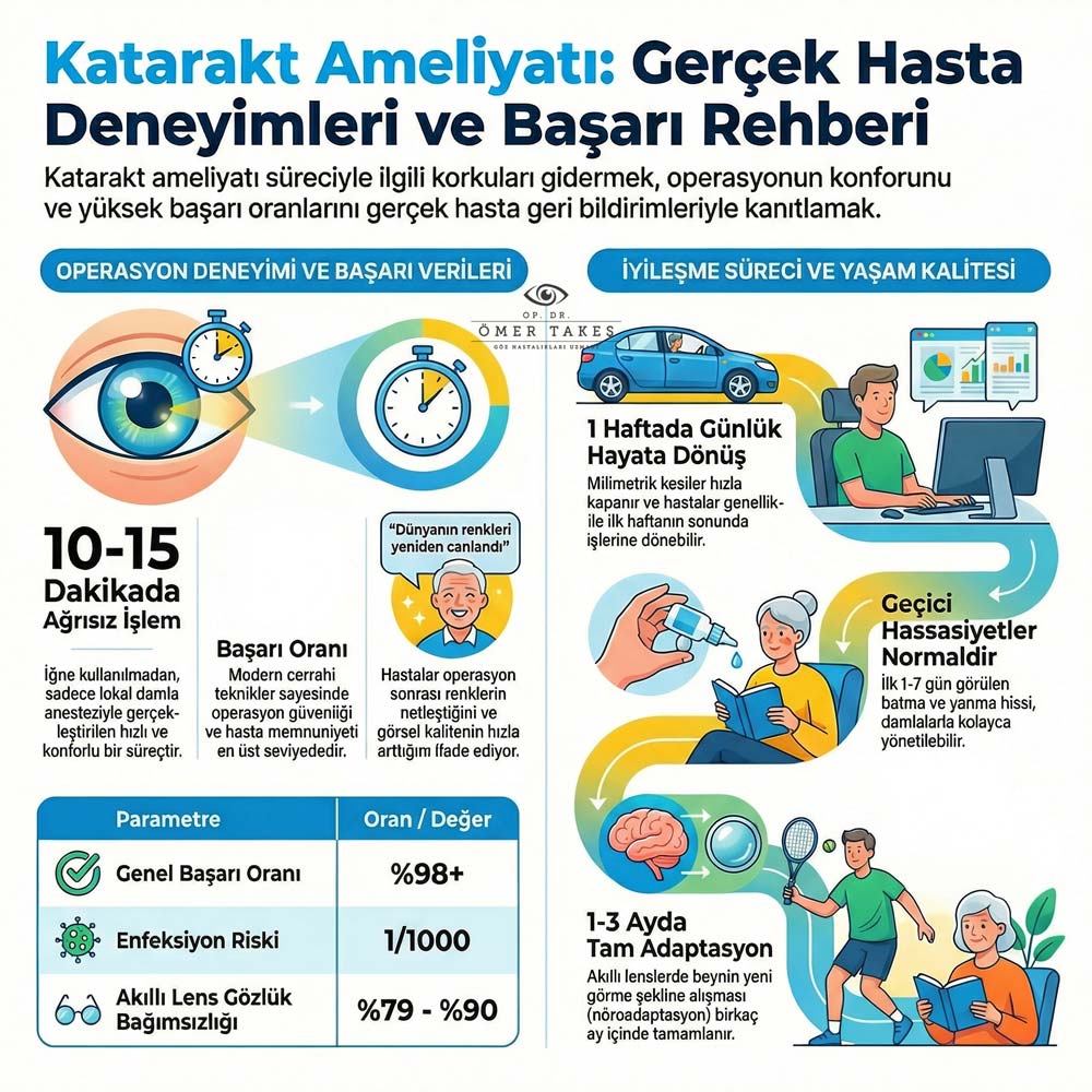 Katarakt ameliyatı yorumlarında hastalar "Renkler yeniden canlandı, gözlük aramaktan kurtuldum" diyor. Kısa adaptasyonla günlük hayat değişir. Gece kamaşma gibi etkiler beyin adaptasyonuyla geçer.