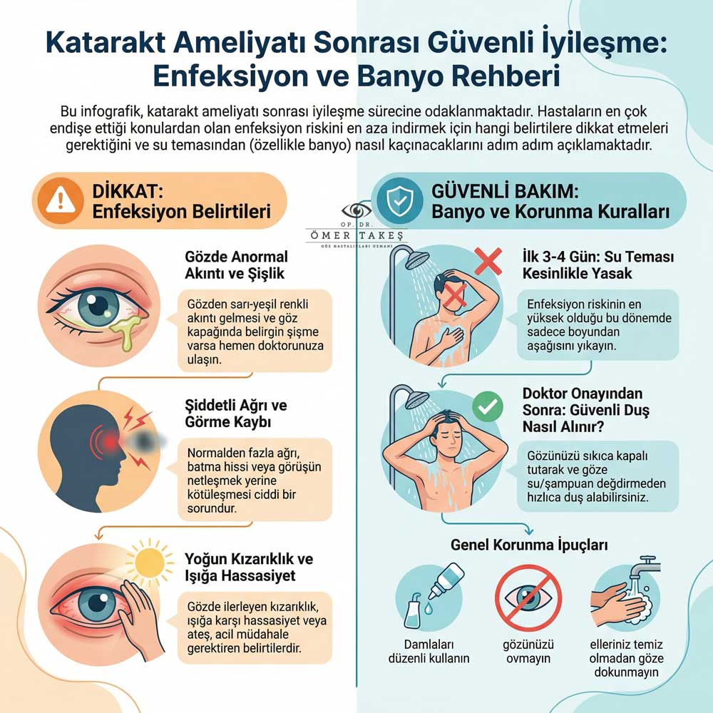 Katarakt ameliyatında, göz içine küçük bir kesi açılarak bulanıklaşmış mercek çıkarılır ve yerine yapay bir lens yerleştirilir. Bu işlem sonrasında, gözün dış etkenlere karşı savunmasız kalması enfeksiyon riskini artırabilir.