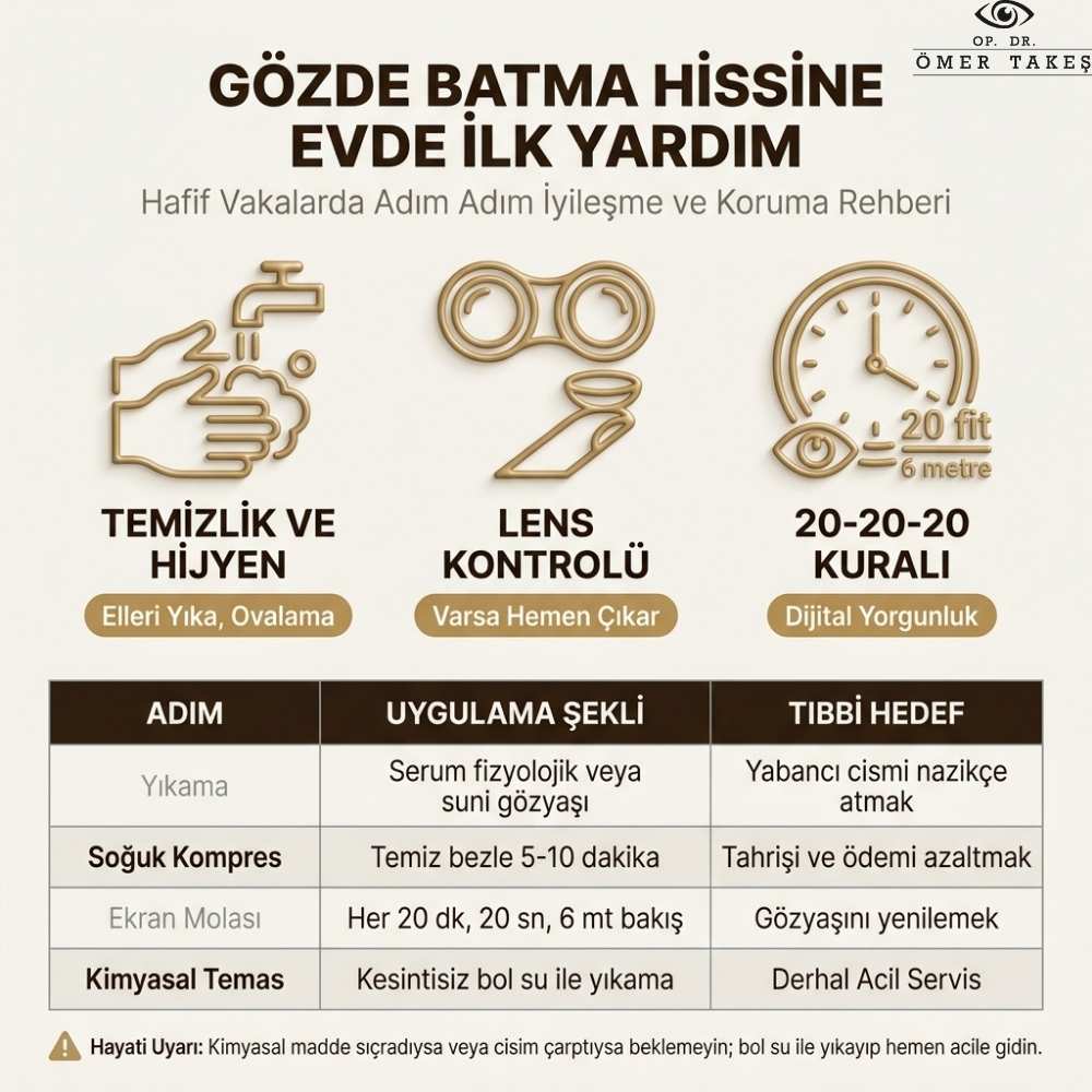 | ⚠️ Acil Müdahale Gerektiren Durum: Ani şiddetli ağrı, ışığa bakamama veya görüşte belirgin bulanıklık ile birlikte gelen batma hissi; kimyasal sıçrama veya yüksek hızlı cisim çarpması, göz kliniği ya da acil servis tarafından derhal değerlendirilmelidir. |